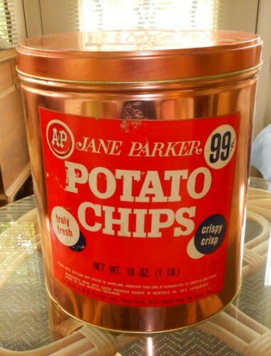 Title (ebay affiliate link): A & P POTATO CHIP TIN - COPPER FINISH w/ORIG PAPER LABEL RARE HTF JANE PARKER