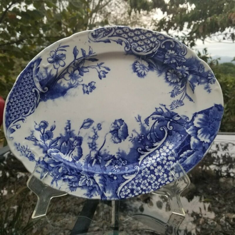 Vintage Blue and White Porcelain 12" Platter. Pretty Floral Pattern.