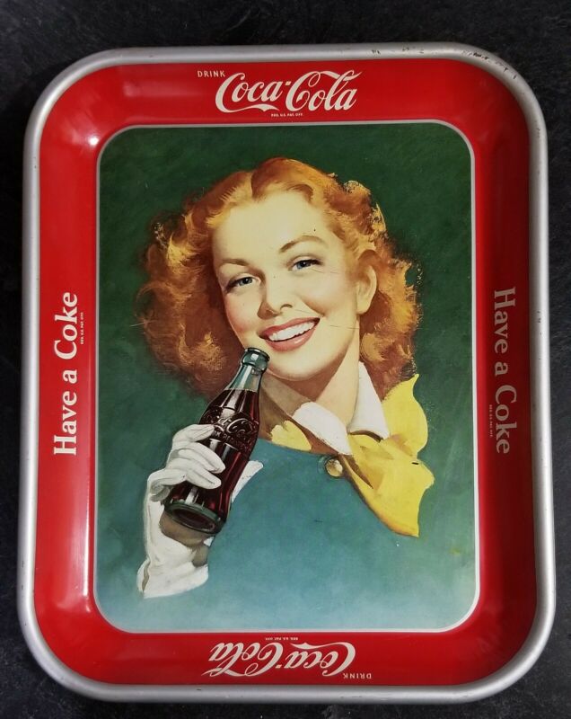 Title (ebay affiliate link): Coca Cola Serving Tray Coke Red Head Girl Yellow Scarf 1950 Heavy Tin Original