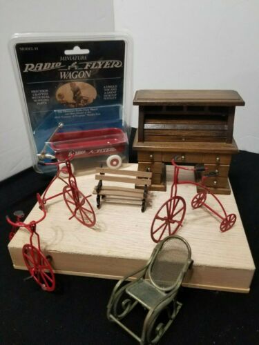 Title (ebay affiliate link): LOT OF 7 VTG DOLLHOUSE MINIATURE ITEMS FURNITURE ROLLTOP DESK BIKES RADIO FLYER
