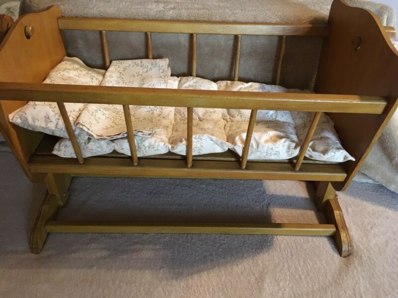 Title (ebay affiliate link): Vintage Wooden Doll Bear Stuffed Bed Swinging Pendulum Rock Cradle Quilt Pillow