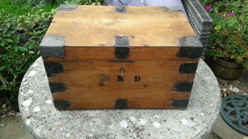 Antique Vintage Wooden Chest .Trunk +key Vgc