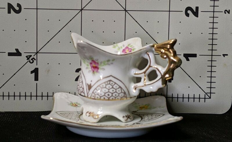 OCCUPIED JAPAN MINI OPEN LACE HANDLE HAND PAINTED ROSES FOOTED TEACUP & SAUCER