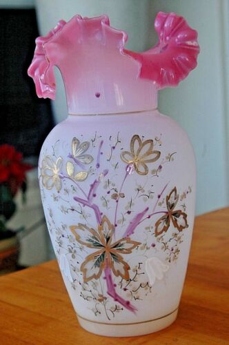 Title (ebay affiliate link): Victorian Pink Blown Glass Deep Ruffles Gold Florals Enameled Vase 9.5"