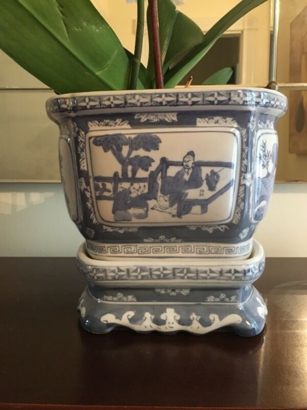 Blue Willow ceramic flower pot on stand