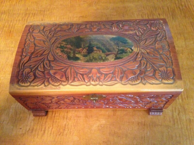 VINTAGE ORNATE CARVED CEDAR WOOD JEWELRY BOX WITH MIRROR & COTTAGE SCENE ON LID