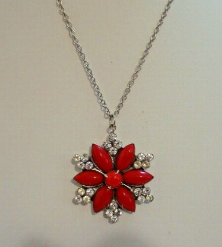 Title (ebay affiliate link): Vintage Red Milk Glass Rhinestone Snowflake Poinsettia Flower Necklace Retro