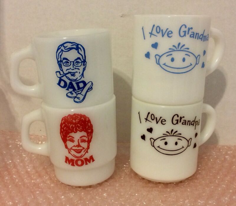 4 Milk Glass Mugs Mom Dad Anchor Hocking Grandpa Grandma Hazel Atlas