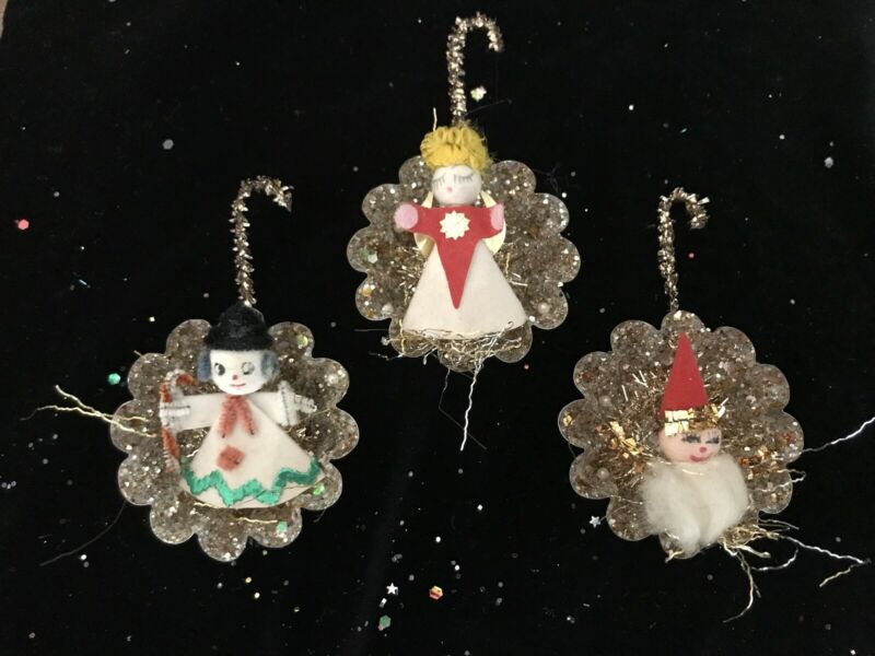 *3 Vintage TART TIN SPUN COTTON CHENILLE Angel Santa Snowman Christmas Ornament