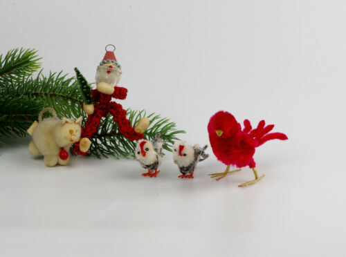 5 Vintage Spun Cotton,Christmas Ornaments,bird,cat,and santa,Czechoslovakia.