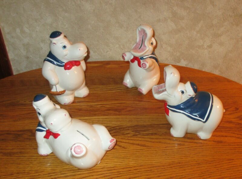 Title (ebay affiliate link): Set of 4, Vintage Collectible Hippo Hippopotamus Ceramic Bank 6" piggy coin bank