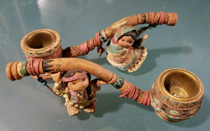 Vtg ENESCO Friends Of The Feather "Pipe Candle Stick Holders" Indian Figurines