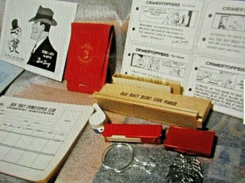 Title (ebay affiliate link): 1961 DICK TRACY CRIMESTOPPER CLUB KIT (BADGE, WHISTLE, CODE MAKER, PHOTO, ETC.)