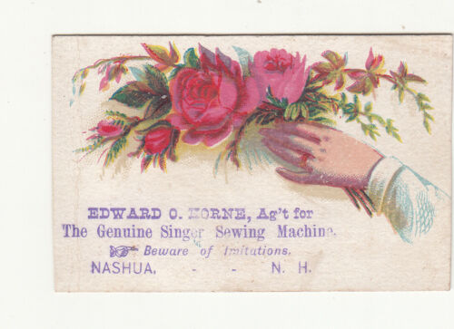 Title (ebay affiliate link): Edward O Horne Singer Sewing Machine Nashua NH Roses Hand Vict Card c1880s