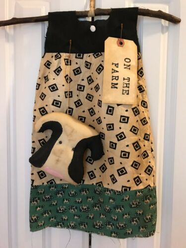 Primitive Hanging Dress Decor Cow Black White Heart On The Farm Tag Folk Art