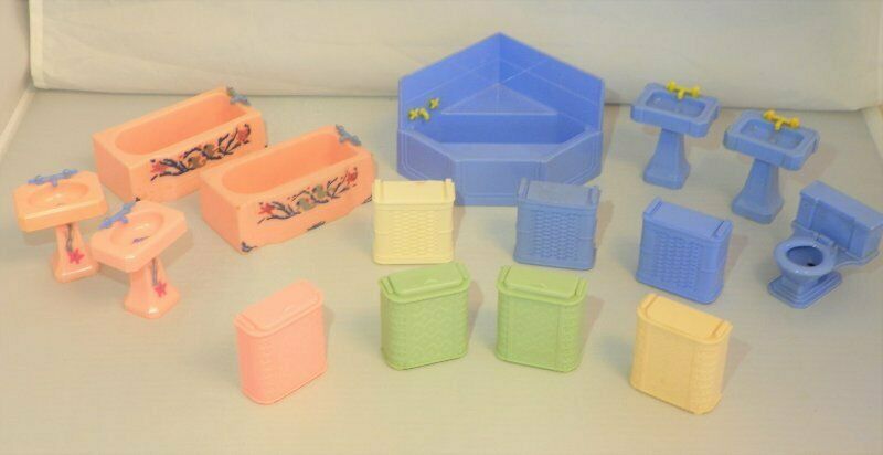 Vintage Dollhouse Furniture Renwal Ideal BATHROOM SINK TUB TOILET HAMPER Plastic
