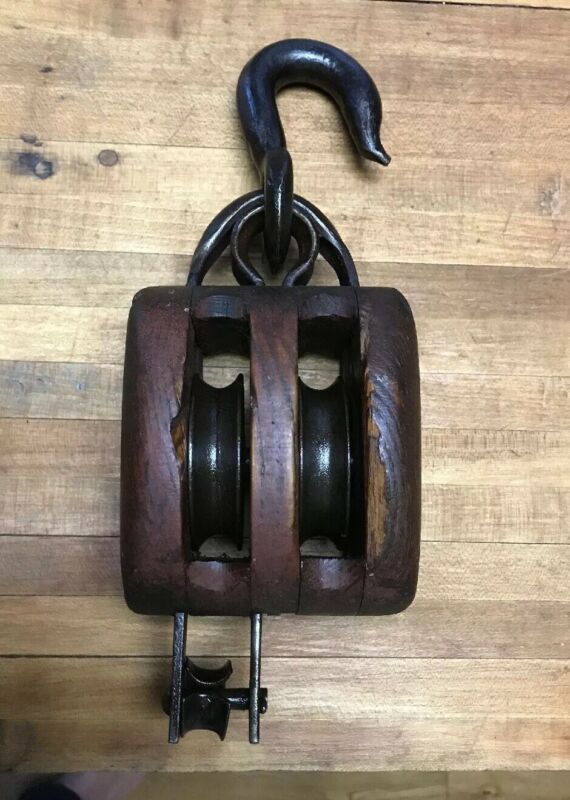 Title (ebay affiliate link): Old Vtg Double Roller Bushed Wood Block & Tackle Pulley Rope Boating Farming