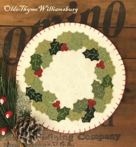 Primitive Stitchery CHRISTMAS Holly Berries Wreath Penny Rug ~ WINTER Candle Mat