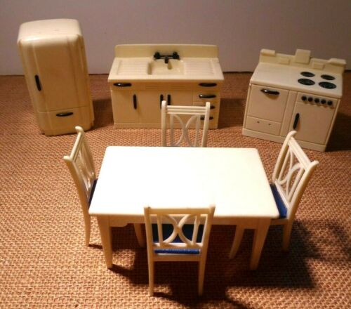 Title (ebay affiliate link): 8 Pc Vintage IDEAL Dollhouse Kitchen Furniture Fridge Stove Sink Table 4Chairs