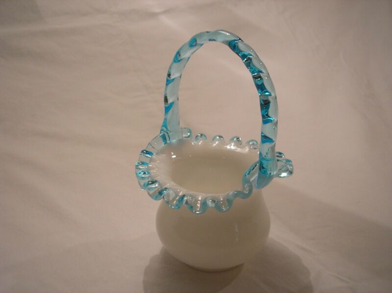 Fenton Glass Basket, 6-1/2" white milk glass w/ aquamarine crest & handle