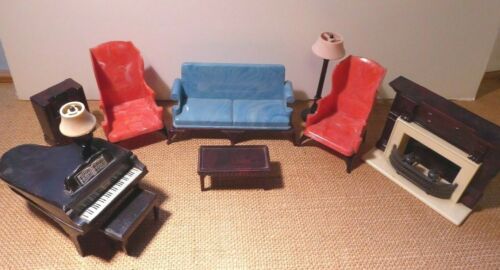 Title (ebay affiliate link): 10 Pc Vintage IDEAL Dollhouse Living Room Furniture + Piano Fireplace Radio Sofa