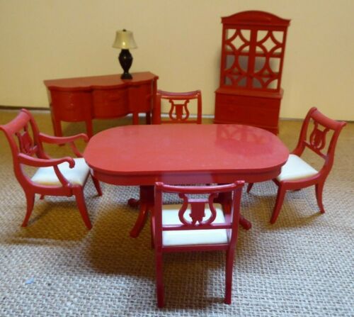 Title (ebay affiliate link): 7 Pc Vintage IDEAL Dollhouse Dining Room Furniture Red Hutch Sideb Table 4 Chair