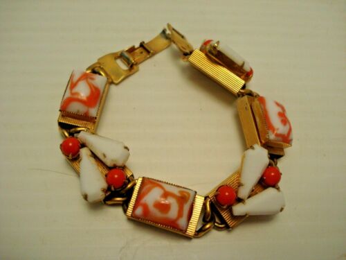 Title (ebay affiliate link): Vintage Mid Century White Orange Milk Glass Rhinestone Bracelet Chunky Bold 7 +"