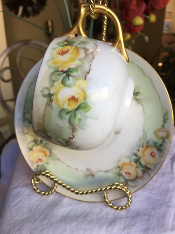 Title (ebay affiliate link): VINTAGE TEA CUP & SAUCER HAND PAINTED LIGHT GREEN TRIM WITH YELLOW ROSES