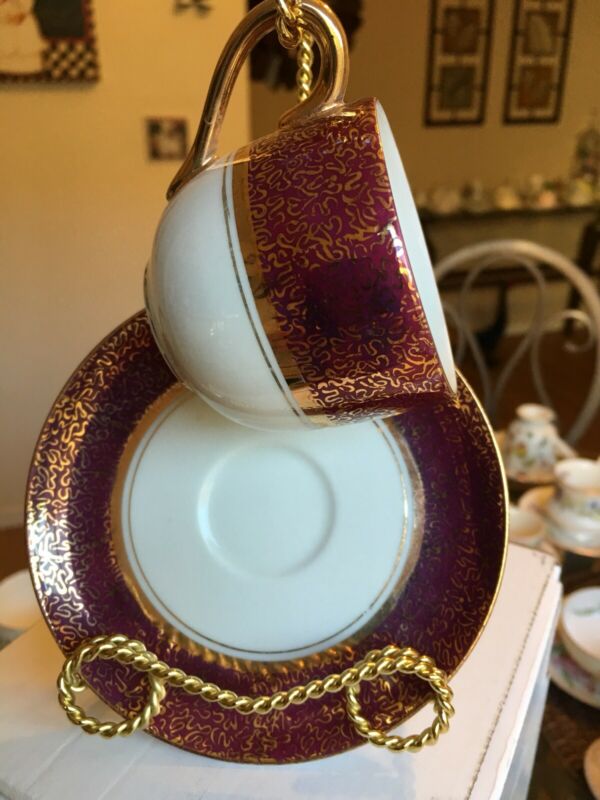 VINTAGE DEMITASSE CUP AND SAUCER MADE IN JAPAN PLUM WITH GOLD INLAY