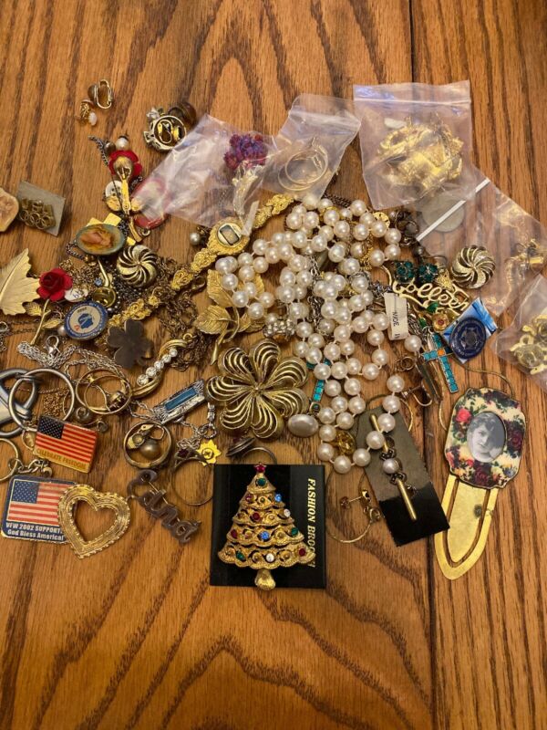 Title (ebay affiliate link): Vintage jewelry Clip on earrings, necklaces, pins, key chains, rings. lot #4