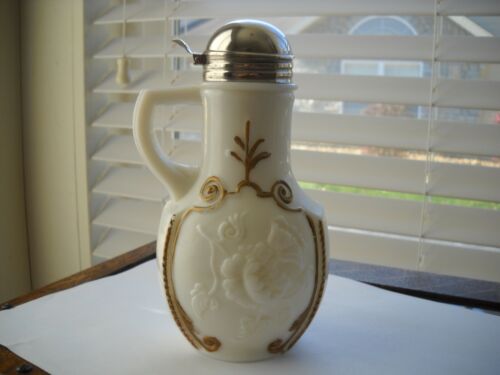Title (ebay affiliate link): ANTIQUE WHITE MILK GLASS SYRUP PITCHER - EMBOSSED FLOWERS & GOLD TRIM