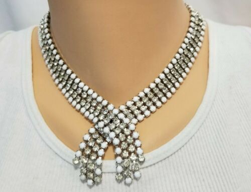 Title (ebay affiliate link): Vintage white milk glass crystal rhinestone necklace collar snap closure