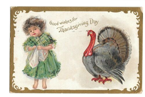 Title (ebay affiliate link): Vintage Postcard Good Wishes For Thanksgiving Day Little Barefoot Girl Turkey DB