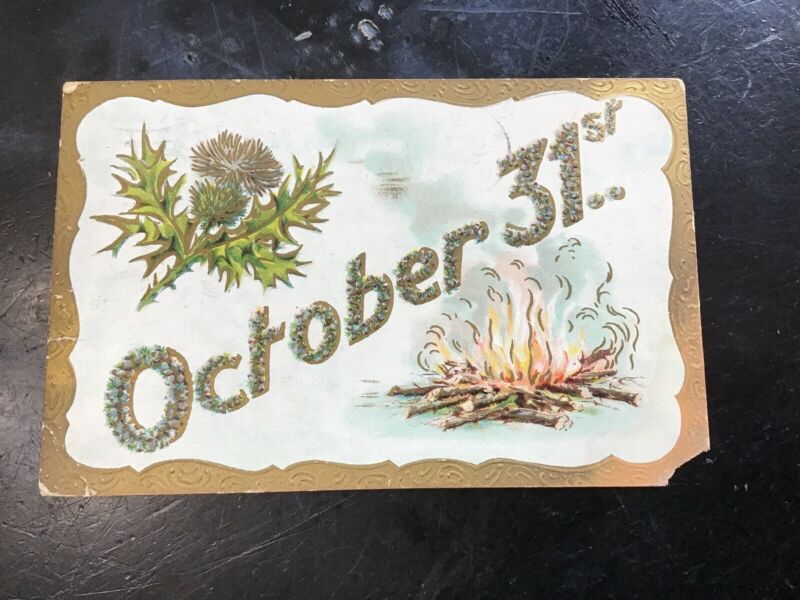 Title (ebay affiliate link): Halloween Postcard, Fire, Fall Leaves, 1909, Trademark 2040 A