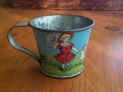 Antique Tin Litho Cup, Childs, Doll, Boy, Girl, Dog,Cat