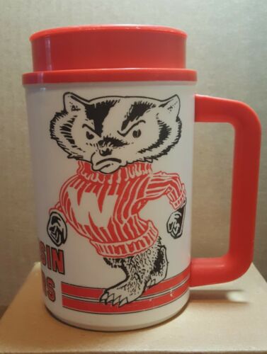 Title (ebay affiliate link): VINTAGE WHIRLEY 22 oz. THERMO T-7 WISCONSIN BADGERS COFFEE TRAVEL MUG CUP + LID