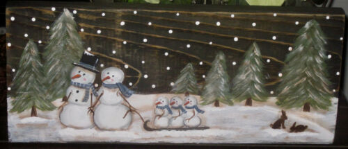 *~*PRIMITIVE*~* HP FOLK ART PRIM WINTER SNOWMEN SCENE *~* TREES *~* BOARD