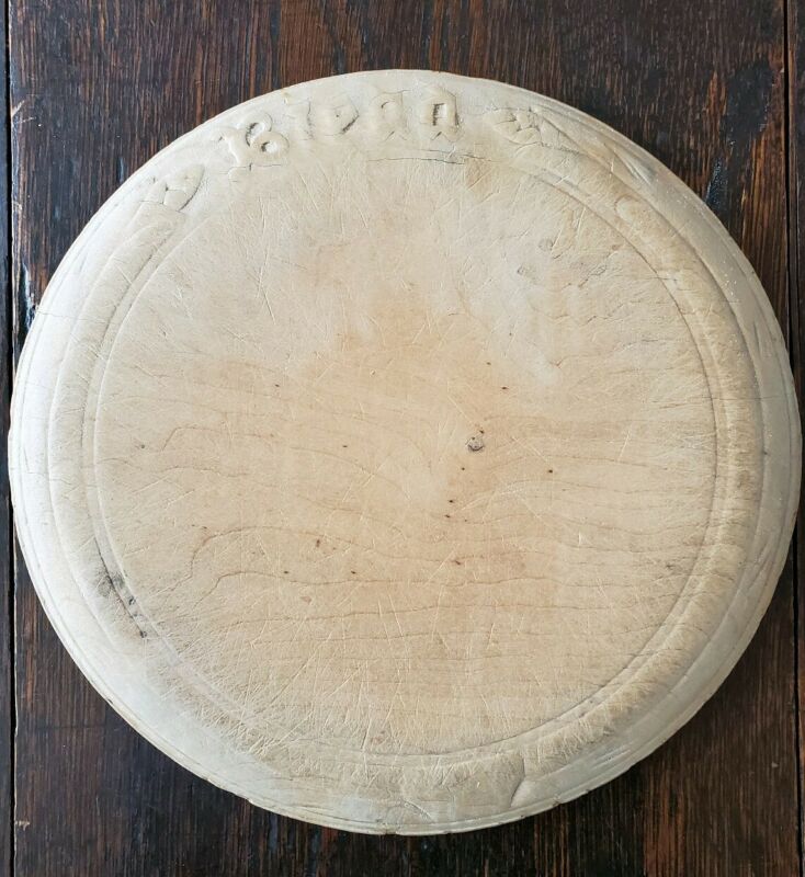Title (ebay affiliate link): ANTIQUE WOOD ROUND BREAD CUTTING BOARD WITH "BREAD" CARVED ON EDGE