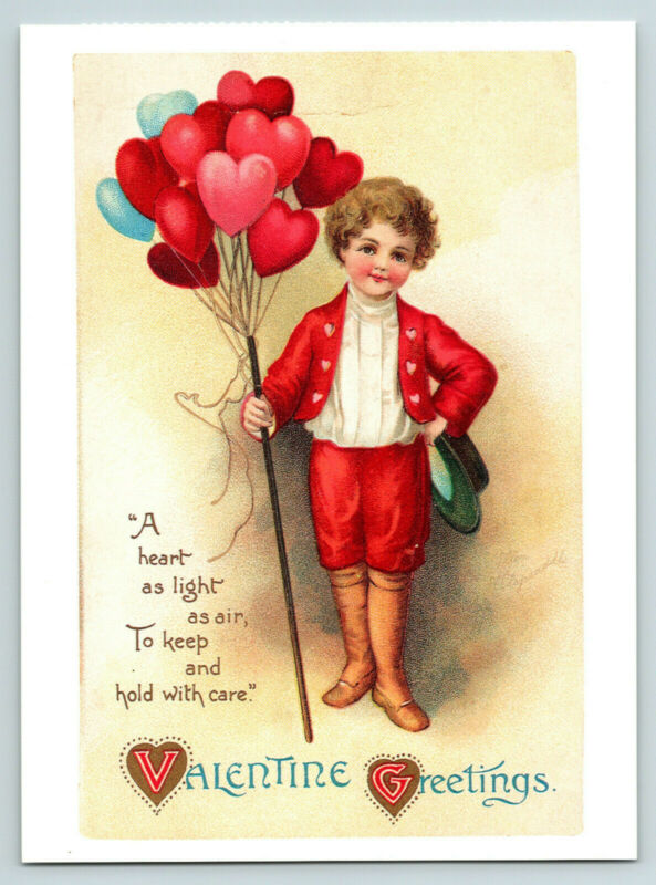 Postcard 4x6 Valentine''s Day Little Boy Heart Balloons c1910 Reproduction A29