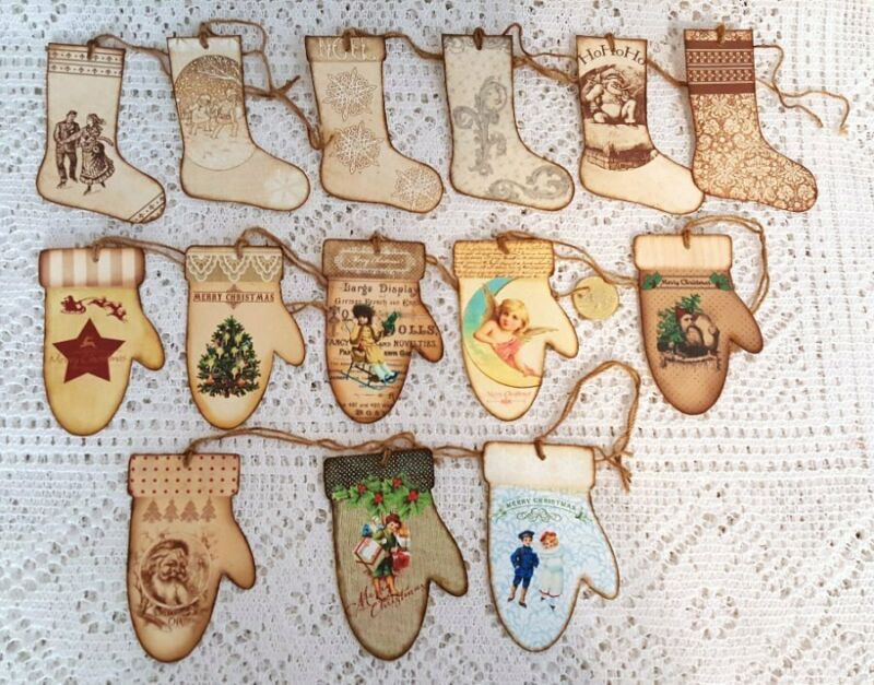 Title (ebay affiliate link): 12~Primitive~Christmas~Vintage~Stocking~Mitten~Linen Cardstock~Gift~Hang~Tags