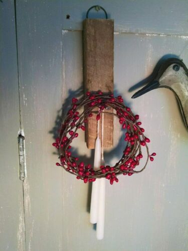 PRIMITIVE TOBACCO STICK PEG HANGER + PIP BERRY WREATH + JOINED CANDLES FARMHOUSE