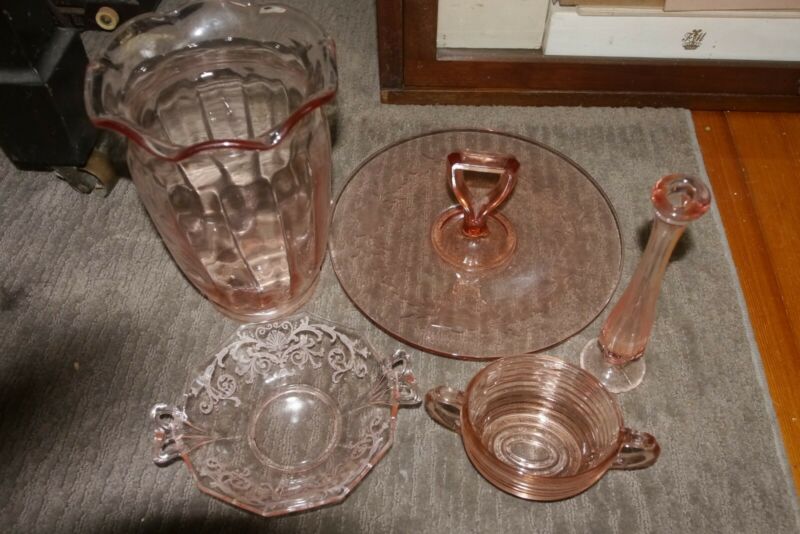 Antique pink depression glass set of 5 pieces Vases Sugar bowl Plate Candy dish
