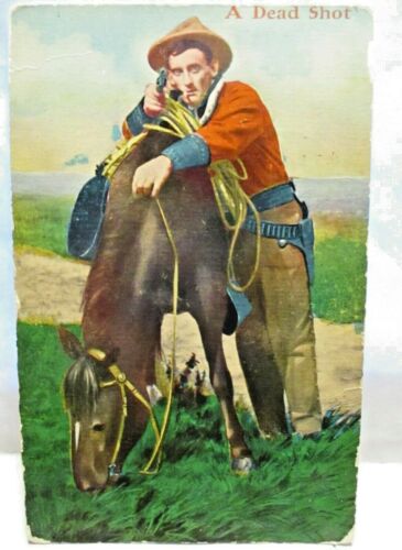 Title (ebay affiliate link): 1909 POSTCARD A DEAD SHOT, COWBOY WITH HORSE, AIMING PISTOL,GUN