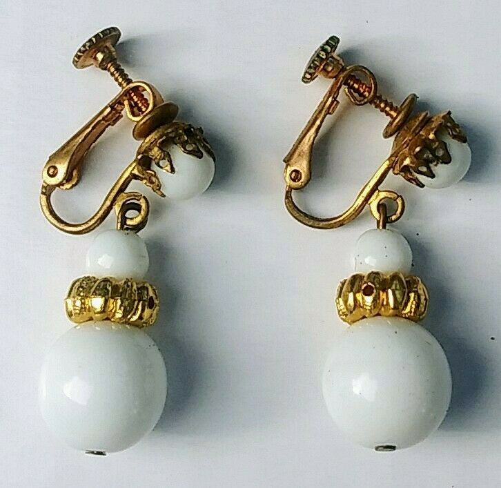 Vintage Signed Miriam Haskell Milk Glass Dangle Drop Screw Clip Earrings