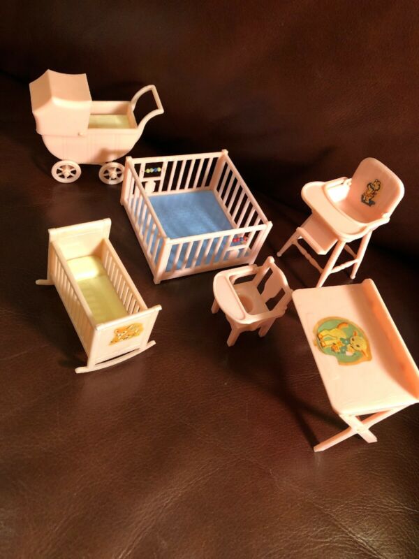 Title (ebay affiliate link): Vintage Plastic Renwal Doll House Nursery Baby Furniture Pink Set Buggy Crib ++