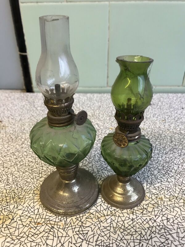 Title (ebay affiliate link): 2 Vintage small oil lamps, Green And Clear glass.