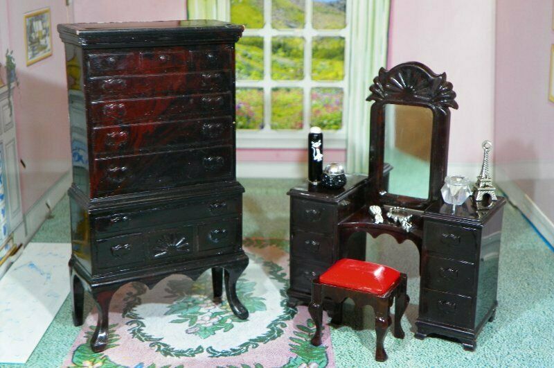 Ideal MIRRORED VANITY BENCH HIGHBOY DRESSER Vintage Dollhouse Furniture Renwal