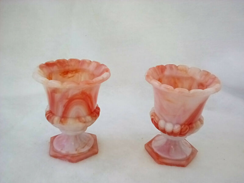 2 Vintage Akro Agate Pedestal Vase/Toothpick - Orange Swirl #764