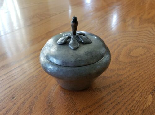 Title (ebay affiliate link): Antique Metals Hammered Tin Apple Shape Covered Sugar Bowl, Wooden Stem, Maker M