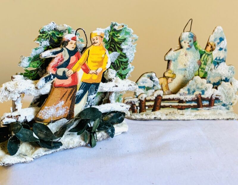 Title (ebay affiliate link): 2 Vintage German 3D Diorama Snow Covered Litho Scenes Christmas Ornaments c.1940